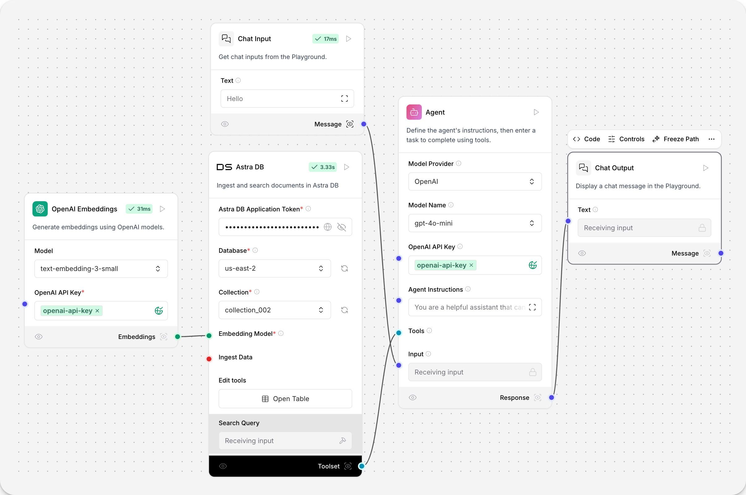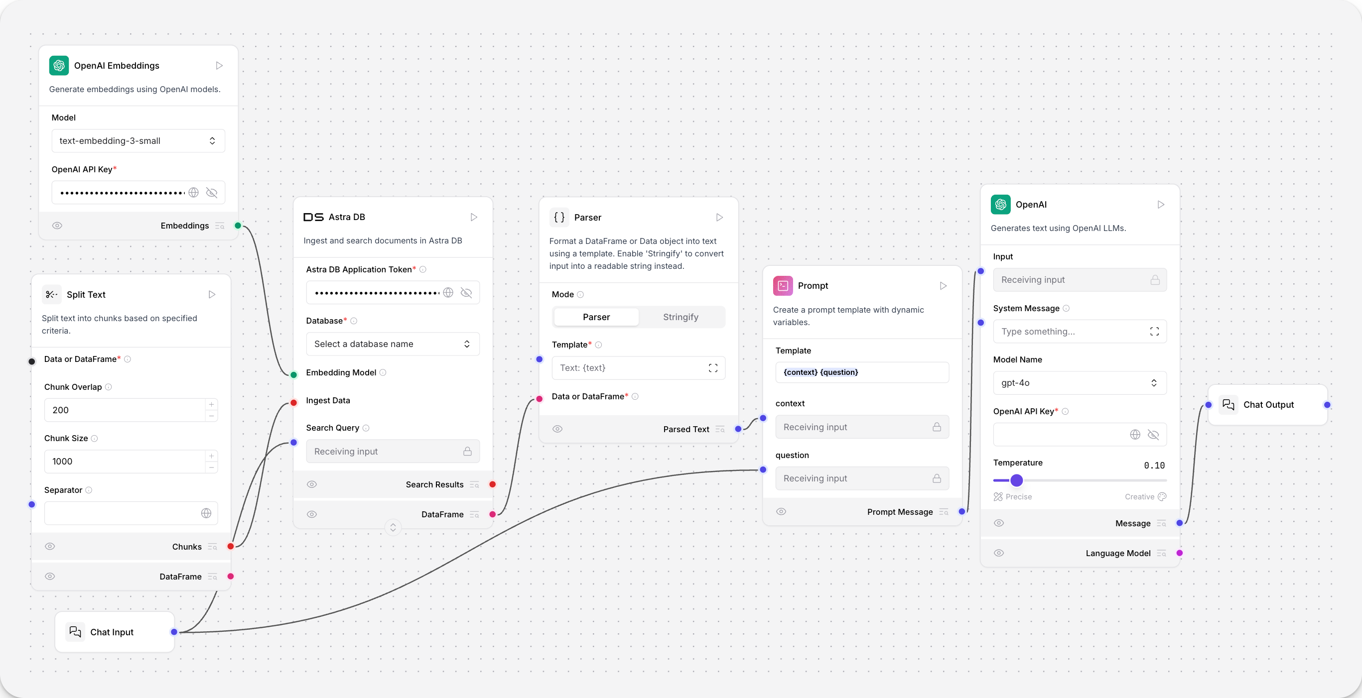 本示例使用 Astra DB 向量存储 组件。您的向量存储组件的参数和身份验证可能不同,但文档摄取工作流是相同的。文档从本地机器加载并分块。Astra DB 向量存储使用连接的模型组件生成嵌入,并将其存储在连接的 Astra DB 数据库中。